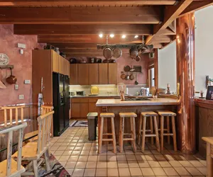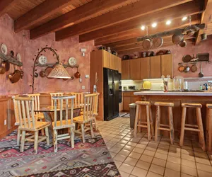The home features a nostalgic Southwestern-inspired design accented by warm textures, abundant natural light, and cozy gathering spaces throughout. The open kitchen flows seamlessly into a generous dining area with seating for eight at the table and four additional stools at the kitchen island, making it ideal for shared meals, celebrations, and après-ski evenings. The entry level also includes a welcoming foyer and a convenient in-unit washer and dryer. Just a few steps down, the main living room invites you to relax by the wood-burning fireplace, creating a cozy setting after a day of mountain adventures.