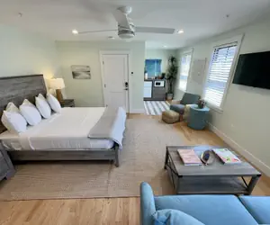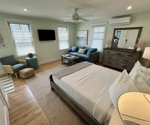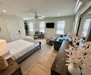 This oversized renovated suite is a total win—queen bed, pull-out sofa in the cozy seating nook (sleeps 4 total), smart TV, mini fridge, microwave, coffee station in its own little spot, mini-split AC/heat, high-speed WiFi, gleaming hardwood floors, beautiful decor/window treatments, ensuite glass walk-in shower, luxe linens/towels, hairdryer, all essentials. Professionally cleaned spotless & dog only friendly . Plenty of open space to lounge, recharge, and dream up your next Newport adventure!
