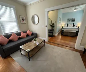 86 Spring Street is a five unit building located on Historic Spring Street with two off street parking spots. There is a single room unit, two large one bedroom suites, a full two bedroom apartment, and a loft. Each unit comes equipped with coffee stations, mini fridges, microwaves, and there are washer/dryers in three of the five units. There is also a kitchenette in Unit 5 and fully stocked kitchen in Unit 4. Please see unit breakdown below for full details of sleeping accommodations.