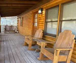 The cabin features two private decks—one screened and one open-air—both overlooking the creek and filled with soothing babbling water sounds. The screened-in deck includes a private hot tub and comfortable outdoor living furniture, creating a relaxing space to unwind in any season. Additional creekside seating with Adirondack chairs offers the perfect spot to enjoy the crisp Smoky Mountain air while taking in the peaceful natural surroundings.