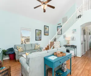 Inside, the home features a bright, open living area with soaring ceilings that create an airy and welcoming space for gathering. The living room flows seamlessly into the dining area and kitchen, making it easy for everyone to spend time together while cooking, relaxing, or planning the next beach day. Coastal touches throughout the home help create a casual beach atmosphere that fits perfectly with the surroundings.