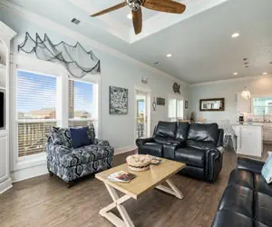The main living area is open and welcoming, with comfortable seating and plenty of space for everyone to hang out together after a day on the beach. The living room flows right into the kitchen and dining area, making it easy for the group to stay connected.