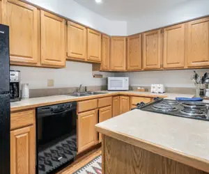 The open kitchen is fully stocked with everything a cook could need. Relax in the cozy living room beside the gas fireplace and take in the views. The primary bedroom features a king bed and an en-suite bathroom with a shower/tub combination. The second bedroom offers a set of twin bunk beds plus a twin bed with a trundle, providing flexible sleeping arrangements for families or groups.