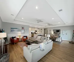 This home is pet-friendly with a $200 Non-refundable pet fee. You and your guest will enjoy sitting on the deck watching sunrises and sunsets while drinking your favorite beverage. This home welcomes you to a spacious, open living room/ kitchen area. The kitchen is fully stocked with all the basics, even a crockpot, making meal-prepping easy. You and your guests can gather around the eating bar area and dining table to enjoy meals together. The comfy furniture in the living room provides the perfect seating area for talking and watching your favorite streaming movies and shows. You can connect to the WiFi by entering the username and password provided for you. The primary bedroom has a king, a twin, and you will enjoy the attached bathroom. Bedroom one will have a queen and twin/twin bunk. Bedroom two will have a queen and a twin bed.
