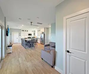 Pelican Post is great for family vacations. This home is on a direct beach access road, making it a quick trip down to the sand! This home has high-speed internet for your convenience to connect and stream your favorite movies and shows on the Smart TVs located in the living room and all bedrooms. You will enter the password and login information provided in a picture frame near the living room TV. You will love the coastal decor and upscale finishes in this remodeled beauty! The main floor features a half bathroom, a kitchen, and a dining area with a large table. There is ample seating that is great for family meals. A small sitting area, with comfy seating and a television, is also on this level. On the second level, you will find additional living space with multiple sofas, a large TV, and a gaming/poker table perfect for eating snacks or family game night! The primary bedroom with a full-sized bed and an attached bathroom with a walk-in shower is on the main level. On the second level, you will find three bedrooms and two full bathrooms with a tub/shower combo. One of these rooms have a twin/queen bunk and a twin/twin bunk. Another of these rooms will have the same, a twin/queen bunk and a twin/twin bunk. The fourth bedroom has a queen bed. On the ground level, there is plenty of parking, covered gathering space, and room to grill (charcoal BBQ pit provided), as well as an outdoor sand shower that feels perfect after a long, fun-filled day at the beach! Your perfect beach getaway is available year-round at Pelican Post!