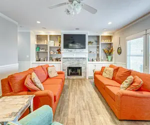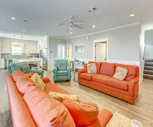 A Southern Belle is a lovely home with spectacular beach views. This front row beauty has 4 bedrooms, 3 full bathrooms, and sleeps 17. As you walk in the door, you are instantly at home! The open living room, dining, and kitchen area are perfect for family gatherings! The well-stocked kitchen has everything necessary for family meals, morning coffee, and evening cocktails. On the main floor, you will find a guest bedroom with a king bed and an attached Jack and Jill bathroom. Upstairs will take you to a quaint sitting area with a sleeper sofa. You will also find 3 beautiful bedrooms and two more bathrooms. Bedroom two will have 2 queens. Bedroom 3 will have a queen and twin/twin bunk, and the fourth bedroom will have a queen and a twin bed. One of the bedrooms even has a port-a-crib for the youngest family member. The views from the upstairs balcony are breathtaking! When you tire of just looking at the beach from the spacious decks, you are steps away from sand in your toes! The covered area downstairs is perfect for BBQs, eating at the picnic table, and children running around laughing. Be sure to take a refreshing shower after a fun-filled day on the beach! You will be charmed by this "Southern Belle" and may never want to leave.