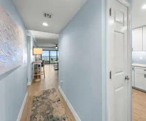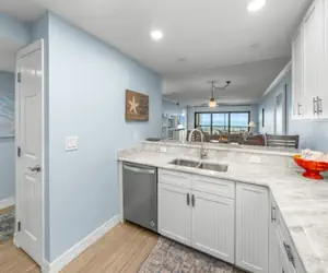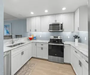 Remodeled in 2023, the interior is fresh and thoughtfully designed with coastal elegance throughout. The open-concept layout includes a comfortable living area with a smart TV, free WiFi, cable, and a queen sleeper sofa for additional guests. The fully equipped kitchen features stainless steel appliances and everything you need to prepare meals at home, whether it’s a casual breakfast or a sunset dinner. A dining area sits just off the kitchen, and a washer and dryer are conveniently located inside the unit.