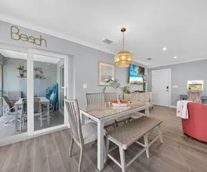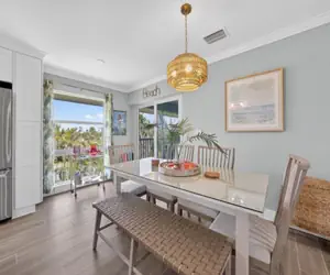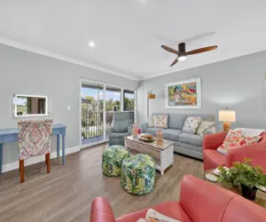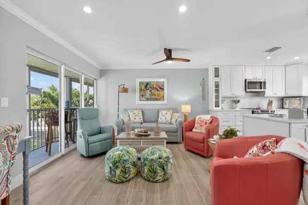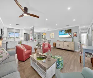 Unit 21 is a fully updated two-bedroom, two-bath condo designed for comfort and style. Bright tropical décor, wood-look plank tile flooring, and an open floor plan create a relaxed coastal feel. The spacious living room offers comfortable seating, a large flat-screen TV, and opens to the dining area and a stunning kitchen with stainless steel appliances, a custom island, and plenty of cabinet space.