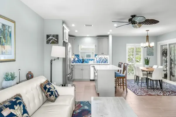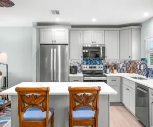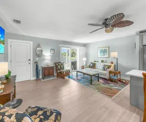 Inside, this second-story, fully remodeled condo is bright, colorful, and thoughtfully designed with unique coastal décor. The open kitchen features a large island, modern finishes, and everything you need for meals at home. The primary suite includes a comfortable king bed, stylish décor, and its own flat-screen TV. The guest bedroom offers a queen bed, a sitting area with a sleeper sofa, and a flat-screen television. The spacious living area flows easily to the screened lanai, creating the perfect spot for morning coffee or evening gatherings.