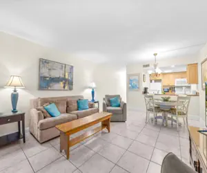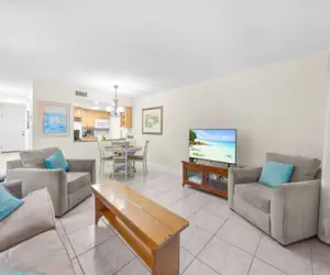 Inside, the condo is clean and functional. The bedroom has a king bed and ceiling fan, the living area includes a queen sofa sleeper, and the kitchen has full-size appliances and basic cookware, though finishes reflect an earlier era. Additional features include two smart TVs, Wi-Fi, tile flooring and elevator access in the building if needed.