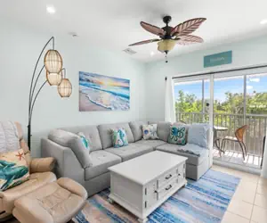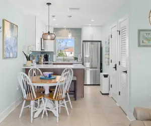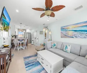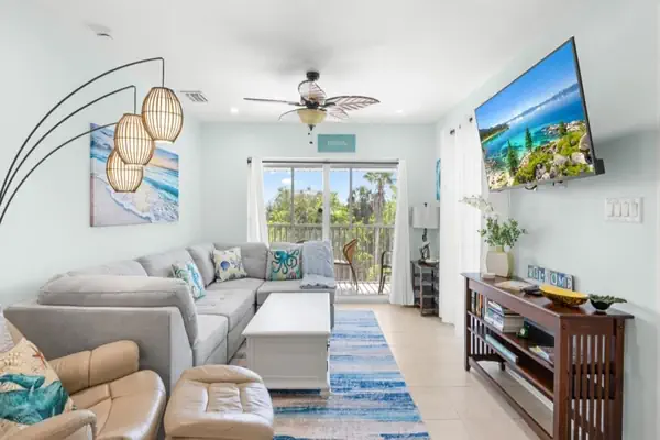This residence features a spacious living room with ceramic tile floors, a sectional sofa, and a flat-screen TV, all in soothing coastal tones of blue and grey. The open dining area flows into a fully updated kitchen with stainless steel appliances and a convenient island.