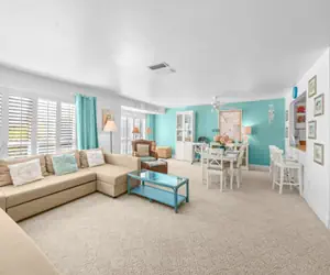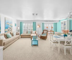 On the first floor, the open living and dining area is sunny and inviting, furnished with updated décor, a flat-screen TV, DVD player, and a generous collection of books and games. Two queen sleeper sofas provide additional sleeping space. The kitchen opens seamlessly to the dining area and breakfast bar with seating for three. It features light wood flooring, ample cabinetry, and is fully equipped for everything from simple breakfasts to full dinners. A stacked washer and dryer are conveniently located on this level, along with a half bath. The downstairs closet is stocked with beach essentials, including a beach cart, chairs, umbrellas, toys, shelling gear, and a cooler.