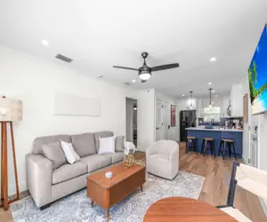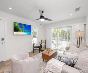 Start your mornings on the screened lanai with a cup of coffee and the soft rustle of palm trees in the breeze. Inside, the open-concept living area is modern and welcoming, with comfortable seating, flat-screen TVs in all rooms, and a beautifully updated kitchen featuring stainless steel appliances and a spacious island with seating for casual meals or happy hour snacks.