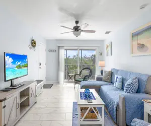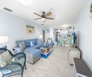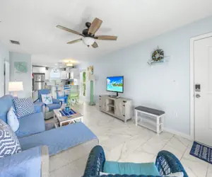 The condo’s soothing coastal blues and accents create a serene atmosphere throughout. The spacious living room features comfortable seating and a flat-screen TV, while the open dining area flows into the updated kitchen, complete with modern appliances and a stylish tile backsplash.