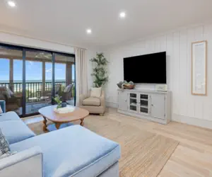 Tranquil views of the Gulf of Mexico in a professionally decorated, spacious three-bedroom condo right on the water. Sanddollar A302 is a unique find on Sanibel Island. When you step into the beautifully decorated top floor Gulf Front condo, you will notice the views and the remodeled spacious kitchen. It features granite countertops, custom cabinets, stainless steel appliances, a large breakfast bar, and everything you need to make a great meal. The large living room has sliding glass doors onto the huge Gulf front lanai. The open living room has a large sectional sofa, a flat-screen television, and stunning views. The open dining room has seating for six, with additional seating at the breakfast bar. The huge, updated master bedroom also has sliding glass doors onto the lanai, direct Gulf views, a large king bed, and a screen television. The master bathroom features dual sinks, a tiled shower, and plenty of counter space. The first guest bedroom has a beautiful nautical design, one full bed, a large closet, and a flat-screen television. The guest bathroom has an updated granite vanity and tiled shower/tub combo. The second guest bedroom has two comfortable spindle twin beds, a spacious closet, and a flat-screen television.