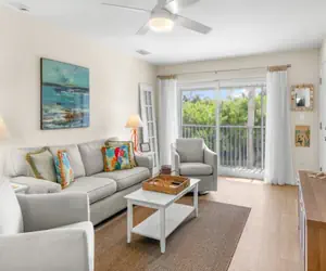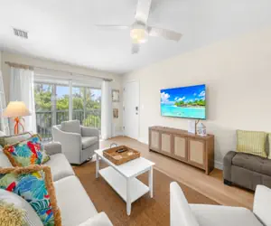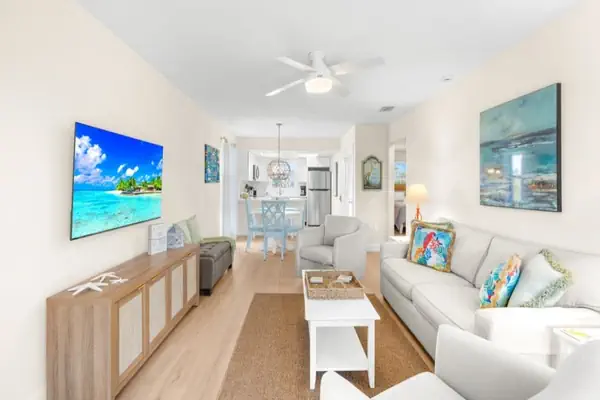 Unit 27 is fully updated and designed with comfort in mind. Enjoy wood floors throughout, a stylish kitchen with a custom island, and bright tropical décor that creates a calming coastal feel. The primary suite features a king bed, flat screen TV, and an en suite bathroom with custom tile. Guest bedroom with two twin beds, flat screen tv and large closet. A second beautifully updated bathroom with tile accents adds convenience for guests.