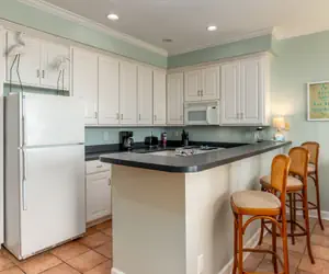 From the moment you arrive, the spacious living area sets a welcoming tone. Large windows allow natural light to flood the room, and the oversized sectional and recliner offer plenty of space for your group to unwind. Whether you’re enjoying movie nights on the large TV or sipping morning coffee before heading to the beach, this common area becomes a favorite gathering spot.