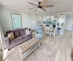 The master bedroom boasts a king-size bed and the living room feature a sofa sleeper, accommodating a total of four guests. The bathroom offer a combination tub/ shower. Equipped with a washer/dryer for your convenience, this charming condo invites relaxation.