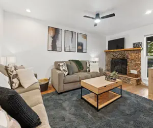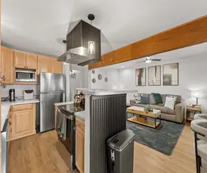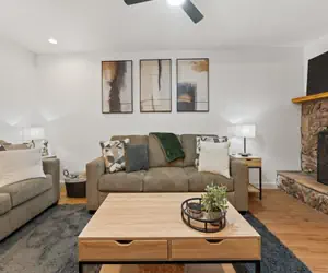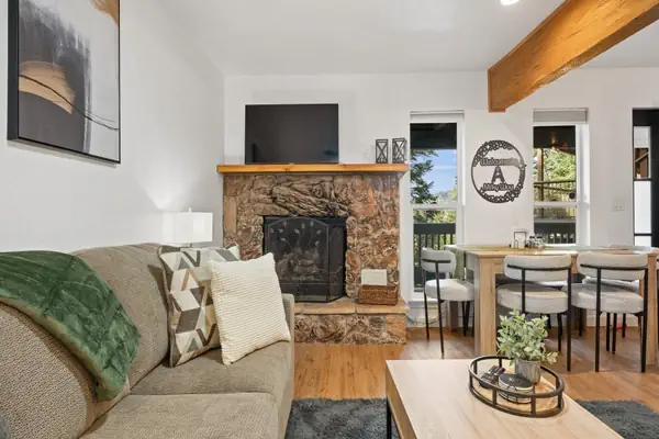 Step inside to discover a fresh, contemporary interior featuring new finishes throughout, updated furnishings, and a warm, inviting layout designed for relaxation after a day of adventure. The living area is bright and comfortable with a cozy fireplace for those chilly winter evenings and is perfect for gathering, unwinding, or enjoying a movie night.