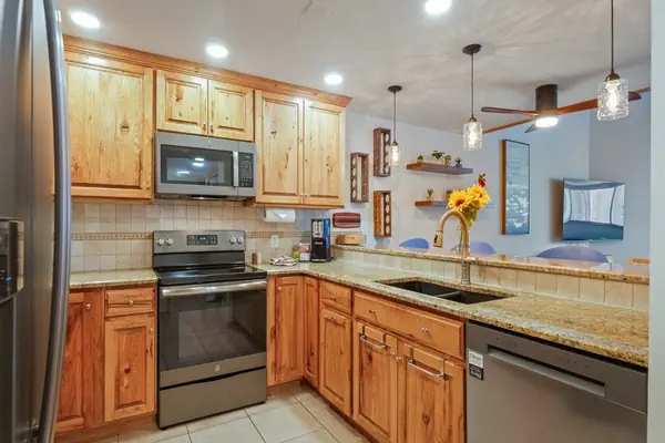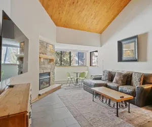 This multi-level, 2-bedroom, 2-bathroom condo sits in Center Village with a direct slope view and is about 75 yards from the nearest lift. It sleeps up to 8 with one king bed in Bedroom 1, two queen beds in Bedroom 2, and a sleeper sofa in the living room.