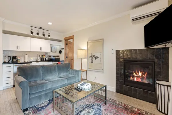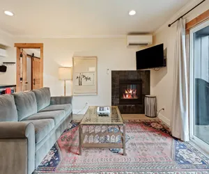 The condo comfortably sleeps two in a king bedroom, with a queen pull-out sofa available for additional guests. Inside, you'll find a cozy fireplace, air conditioning, and a thoughtfully designed living space that's perfect for relaxing after a day exploring Bend.