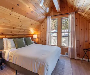 This cabin offers a cozy and rustic mountain retreat suitable for families and friends, and your furry friends (up to two dogs allowed). With convenient access to the lake, the mountains, and numerous outdoor activities in Tahoe, it serves as a great base for your adventures. Golf enthusiasts will appreciate its location on the second hole of Old Brockway Golf Course, ideal for improving your swing amidst the tall pines. The interior features rustic elements such as pine walls and large windows that provide views of the spacious backyard and golf course.