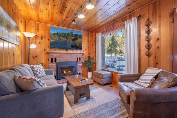 The living area includes a brick gas fireplace and a large flat-screen TV, creating a comfortable spot for relaxing after a day outdoors. Mealtime is made easy at the large kitchen table, which seats six and complements the kitchen's cabin-inspired atmosphere for home-cooked meals. Outside, the backyard offers comfortable seating and a barbecue area, perfect for enjoying sunny days while overlooking the golf course.