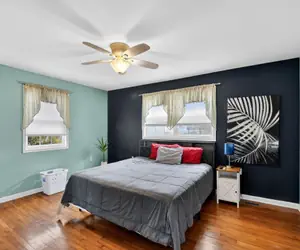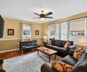 Inside, the home features hardwood floors throughout and a practical layout designed for easy living. The living spaces are warm and welcoming, making it easy to relax after a day exploring the area. Three well-sized bedrooms and two full bathrooms provide comfort and privacy for guests, whether you’re staying for a weekend getaway or a longer visit.