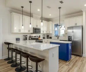 The kitchen opens seamlessly to the living and dining areas, offering white cabinetry, stainless steel appliances, a striking blue island, and plenty of workspace for group cooking. The large dining table and wide open layout make meal times easy and enjoyable for everyone. The second dining table seats six and is located to the side of the large dining table.