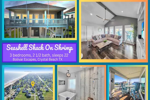 This Coastal home in the heart of Crystal Beach is an exquisite vacation or weekend getaway! Seashell Shack on Shrimp is located on a quiet street with direct access to the beach via vehicle or golf cart. You are just steps away from the Gulf! This well-maintained home offers the perfect blend of comfort and coastal charm. Entering this home, you will be drawn to the open-concept living, kitchen, and dining areas, along with its beautiful decor. The living area provides ample seating for all of your guests with beautiful views of the outside. The spacious kitchen, complete with stainless steel appliances, large bar/island seating, and plenty of storage and counter-top space, will make preparing meals a breeze! Coffee-lovers will be pleased with the easiness of having both a regular drip coffee maker and a Keurig-Single Cup coffee maker. The dining table is grand for eating meals with guests, playing cards, or even working on puzzles with your family and friends. The primary bedroom is spacious with a King-sized bed and attached bathroom that is straight out of a five-star hotel! The double-sink vanity has ample space for all your items. The soaker tub is ready to help you soak away all your cares, and the walk-in shower is beautiful! Bedroom 2 has two Queen-sized beds and a twin bed. Bedroom 3 has two queen-sized beds. There is a full-sized bathroom with a tub/shower combo for your guests as well as a half-bathroom located near the kitchen/living area. All the bedrooms and the living area have TVs with streaming capabilities. Enter the WiFi information located near the TV to log in and stream your favorite shows and movies. You will want to spend your mornings and evenings outside enjoying our glorious Sunrises and spectacular Sunsets from the multiple decks. Have brunch on the deck sipping your favorite beverages, listening to the sounds of nature, and feeling the coastal breezes. Downstairs, you will find a spacious covered area for entertaining and having a delicious meal prepared on the charcoal grill! When the waves and sunshine call out, you are a short distance from the sandy shore. After a wonderful outing on the beach, be sure to rinse away all the sand in the outdoor shower.