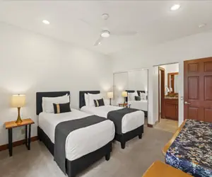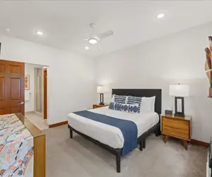 The spacious primary bedroom features a comfortable California King bed, top quality Samsung Smart TV, and an en-suite bathroom with a large walk-in shower with two shower heads and a bench. The equally roomy second bedroom, with the option of either one King size bed or two twin size beds, boasts another in-room TV, and an ensuite bathroom with both a shower and tub.