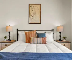 Horseman’s Hideout offers the perfect blend of comfort and entertainment, accommodating up to 14 guests in three beautifully appointed bedrooms and 3.5 bathrooms. Two king suites with private attached baths provide a relaxing escape, while the bunk room with two queen-over-queen bunks is perfect for groups. Enjoy evenings in the private hot tub, gather around the fire table, or grill and dine outdoors in the inviting seating area. Inside, the garage game space with skeeball and air hockey adds an extra level of fun, and the fully stocked kitchen is ready for everything from quick breakfasts to group dinners.