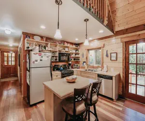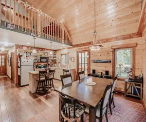 Your family will have a delightful time in this 2-story, 3-bedroom, 2-bath log cabin with a natural pine interior. The first floor features a large, open, and airy kitchen/dining/living area with a dishwasher, vaulted ceilings, complimented by a wood stove, (firewood provided), and a breakfast bar. There is one bedroom with 1-queen sized bed, a second bedroom with 2-twin sized beds, and one full bath augmented by a laundry cubby with a full-size washer/dryer. The second floor features a loft sitting area, a primary bedroom with 1-queen sized bed, and an adjoining full bath. Exterior features include a wrap-around deck and an enclosed summer porch. This pet-friendly (2-Pet Maximum, No Exceptions) and monitored vacation property will sleep up to 6-persons (ENFORCED Maximum Occupancy!).