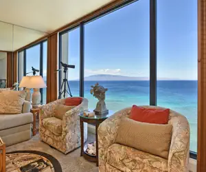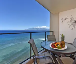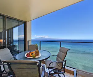 Ocean front on the eleventh floor on North Ka'anapali beach in the Molokai Tower. An ocean front bedroom allows for a greater view and lanai access in this Deluxe unit that has been remodeled and updated. The bathroom features double sinks and a glass block walk-in shower, no tub.