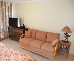 You can enjoy your breakfast and morning coffee on the spacious lanai or at the tiled kitchen bar counter. The bar stool seating takes the place of a traditional table and chairs.