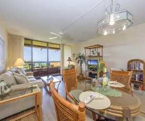 Welcome to paradise at the Kahana Villas and our beautiful newly remodeled high end furnished condo. A soothing view of the ocean and the tropical landscaped grounds are yours to enjoy in this 4th level ocean view one-bedroom, one-bath condo. This home sleeps four with a luxurious king bed in the bedroom and a sofa bed in the living room. There is easy access to the pool, jacuzzi, tennis courts, the ocean, and the gardens. It's great for entertaining. The pleasant island style furnishings and fully equipped gourmet kitchen provide an environment where guests can feel comfortably at home. For your indoor entertainment pleasure, there is a cable TV in the living room as well as a CD and DVD player. We have free WIFI in the condo for your use. The codes are on the WIFI box. The large lanai is a marvelous place for relaxing or dining.
