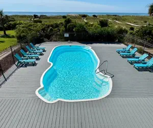 Step outside to enjoy a large, full-width sun deck furnished with cushioned lounge chairs, rockers, and dining tables. Take a dip in the 36’ x 16’ private pool, stroll down your private boardwalk to the beach, or rinse off in the enclosed hot/cold outdoor shower. Additional amenities include a park-style charcoal grill and ample paved and covered parking under the home.