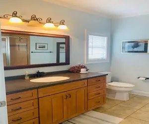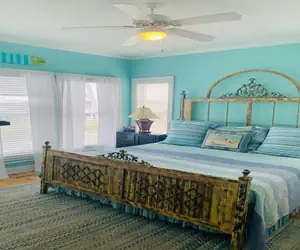 Shore Beats Workin' is perfectly situated on a corner lot and designed for relaxed coastal living, featuring an inverted floor plan that maximizes space and views. The open-concept living room, dining area, and kitchen create an ideal gathering place for families and groups to enjoy time together.