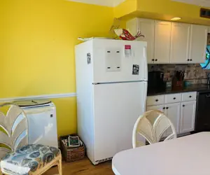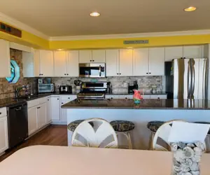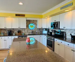 The well-equipped kitchen includes stainless steel appliances and two full-size refrigerators, making meal prep easy and convenient. With two separate living areas, everyone has space to relax, watch TV, or unwind after a day at the beach. Flat-screen TVs are located throughout the home. The upstairs living area also includes two computer desks and a game/puzzle table, perfect for remote work, schoolwork, or family fun.