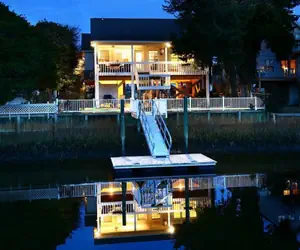 The living area features a large 55-inch flat-screen smart TV with whole-house DVR, along with new comfortable furniture. The fully equipped kitchen makes meal prep easy, and each bedroom includes its own TV for convenience. Step outside to enjoy the floating dock, or rinse off after a day on the water in the enclosed hot/cold outdoor shower. For extra entertainment, the home offers a large pinball machine downstairs and a Ms. Pac-Man arcade.