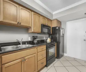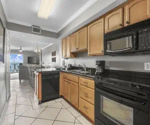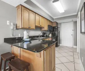 The open kitchen features abundant cabinetry, ample storage including all cooking essentials, granite countertops, and modern black appliances. Perfect for culinary adventures or simply preparing a quick snack before heading out to the beach.