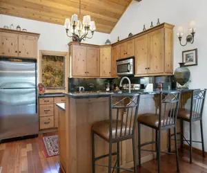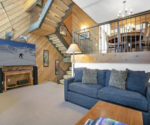 Up another small flight of stairs is the kitchen, dining area, 3rd full bathroom. The dining area is perched overlooking the windows in the living room and has a dining table that seats six. The well appointed kitchen features a bar with additional seating for three and has been updated with granite counter-tops and stainless steel appliances. The spacious laundry room features a full-size washer and dryer; the 3rd bathroom next to it features a shower. On the top (5th) level there is an airy loft with two twin beds that can be converted into a king and a TV, the perfect place for the kids in the group to have some private time for themselves. *This unit does not have air conditioning however, mountain nights are very cool.