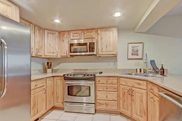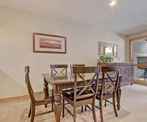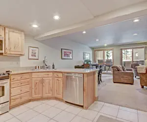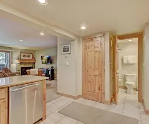 The living room has a Queen Murphy Bed that folds up into the wall. There is also a Queen Sleeper Sofa and a flat screen TV. The private balcony faces towards the American Eagle chairlift. In the summer, there is a babbling creek running by. There is a full bathroom off the kitchen. There is also a gas fireplace for you to enjoy.