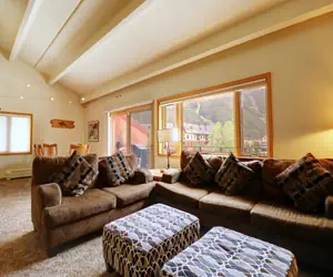 The main floor includes the kitchen, living room, and two bedrooms, each with a queen bed. The second floor has another bedroom with a twin-over-full bunk bed, plus an additional twin bed. The second living room/loft area has a set of twin beds. The third bathroom is located off the upstairs bedroom. One car can park in the first-come, first-served outdoor parking. All overflow vehicles can park in the North Alpine Lot at the entrance of Copper Mountain for an additional fee during the winter (summer parking is free). The building also has a shared laundry facility located on the second floor next to the elevator, it is coin operated.