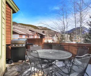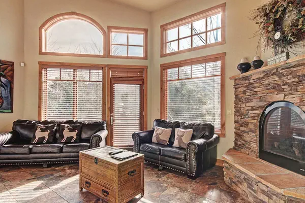 Welcome to this stunning 4 bedroom home with a private hot tub and majestic mountain views! The bright and open living room features vaulted ceilings, floor to ceiling windows, a gas fireplace, flat screen TV, and leather furniture. There is a large private patio off of the living room which features outdoor dining table with seating for 5 people, and stunning views of River Run.