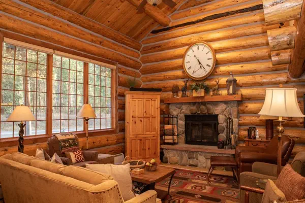 -- Living Room: wood fireplace, large flat screen TV