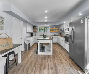Lagerheads is a two-story, 4-bedroom, 3-bathroom vacation home that comfortably accommodates up to 14 guests. Recently refurbished, the home features new flooring on the second floor, updated bathroom vanities, modern appliances, and refreshed kitchen and decor. Upon entering the main floor, guests are greeted with a charming kids' "hang out" area, complete with vibrant bean bag chairs and a flat-screen TV with Blue Ray/DVD player. Additionally, there is a kids' room with two bunk beds, each featuring a full-sized bed on the bottom bunk, catering to a total of six children. A king-sized bedroom and a newly renovated full bathroom with double sinks and a shower are also located on the first floor.