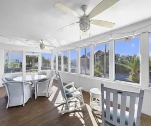 The second floor boasts an expansive open living area, dining space, and fully-equipped kitchen with ample seating for all guests. Guests can relax on the spacious open deck, grill, sip cocktails, and oversee the pool activities below. An alternative dining option is available on the large screened front porch, offering breathtaking sunset views over the Gulf. Furthermore, the second floor comprises a luxurious Master King Suite with a private bathroom, a large guest room with two queen beds, and a full bath in the hallway.