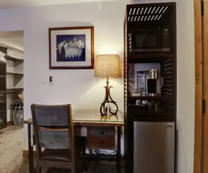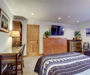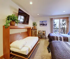 This remodeled hotel room features 2 queen beds, as well as a twin murphy bed. There is a bathroom attached to the unit, as well as a small fridge, coffee maker and microwave in the condo. Enjoy the view off of the balcony of the unit, and take in the fresh Rocky Mountain Air.