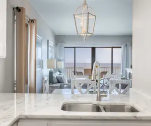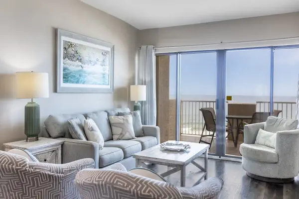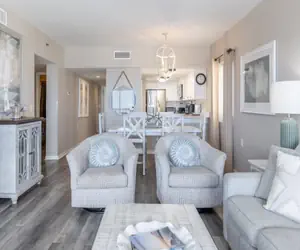 This beautifully designed 3 bed/3 bath condo boasts an open-concept living area with a plush sleeper sofa, two recliners, an easy chair, and a television—the perfect setting for entertaining or unwinding after a day on the beach.